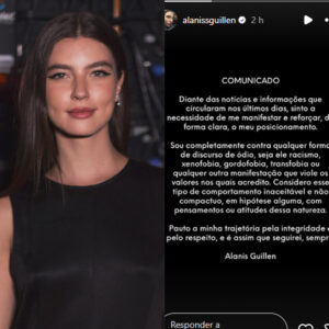 Alanis Guillen viu seu nome viralizar após postagens antigas de sua então namorada, Giovanna Reis, repercutirem nas redes sociais. O conteúdo foi publicado em 2012 no X – antigo Twitter – e reúne mensagens bastante polêmicas. Diante da repercussão do assunto, a atriz confirmou o término do namoro ao Lucas Pasin e usou as redes sociais para postar uma nota de repúdio. Através dos stories, sem citar nomes, ela condenou o tipo de comportamento da ex. Diante das notícias e informações que circularam nos últimos dias, sinto a necessidade de me manifestar e reforçar, de forma clara, o meu posicionamento.Em seguida, ela deixou claro ser contra o discurso feito por sua ex:Sou completamente contra qualquer forma de discurso de ódio, seja ele racismo, xenofobia, gordofobia, transfobia ou qualquer outra manifestação que viole os valores nos quais acredito. Considero esse tipo de comportamento inaceitável e não compactuo, em hipótese alguma, com pensamentos ou atitudes dessa natureza.Alanis então encerrou:Pauto a minha trajetória pela integridade e pelo respeito, e é assim que seguirei, sempre. Vale lembrar que Alanis curtiu o Carnaval de Salvador ao lado de Giovanna. Já nos segue no Instagram? Por lá, compartilhamos tudo sobre celebridades, estilo, realities, séries, teen, bastidores do entretenimento e reportagens exclusivas. Vai ficar de fora dessa? O nosso perfil é @portal.estrelando