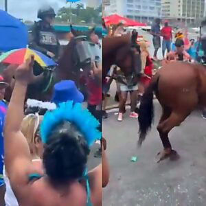 Cavalo da PM se assusta, corre e cai sobre foliões em desfile de carnaval; VEJA VÍDEO
