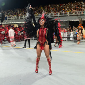 A cantora desfilou na madrugada deste sábado, dia 14, como Madrinha de Bateria da Dragões da Real
