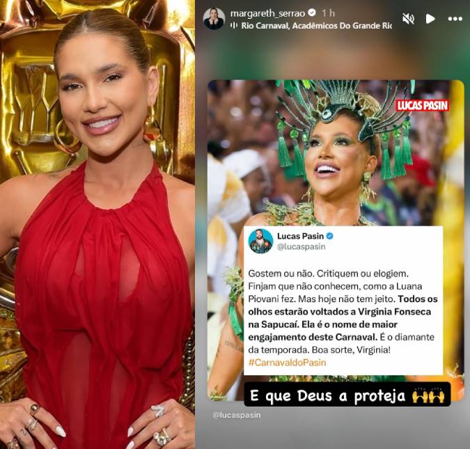 Nesta terça-feira, dia 17, Virginia Fonseca fará sua estreia no Carnaval do Rio de Janeiro como Rainha de Bateria da Grande Rio. Certamente bastante orgulhosa, Margareth Serrão, mãe da influenciadora, usou as redes sociais para enviar suas melhores energias para a herdeira. A empresária repostou uma imagem publicada pelo jornalista Lucas Pasin, na qual, ele defende a ex-apresentadora do SBT, afirmando que os olhos das pessoas estarão nela durante sua passagem pela Marquês de Sapucaí. Gostem ou não. Critiquem ou elogiem. Finjam que não conhecem, como a Luana Piovani fez. Mas hoje não tem jeito. Todos os olhos estarão voltados a Virginia Fonseca na Sapucaí. Ela é o nome de maior engajamento deste Carnaval. É o diamante da temporada. Boa sorte, Virginia!, pontuou o colunista. Margareth, por sua vez, aproveitou para escrever como legenda de seu repost: E que Deus a proteja! Vale pontuar que recentemente, Luana Piovani criticou a Rainha de Bateria da Grande Rio após a influenciadora ter participado de um especial de Carnaval do Domingão com Huck. Na ocasião, a atriz teve uma época em que gostava do apresentador Luciano Huck, mas agora ele teria pirado na ganância. Nossa! Que texto bom, engraçado e criativo… sqn! Eu gostava dele quando ele era só um abastado e inteligente, mas aí, para variar, pirou na ganância, vendidaço, já ela… LÁ ELA.
