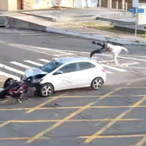 Câmera de segurança registrou o impacto que arrastou a moto por mais de 40 metros