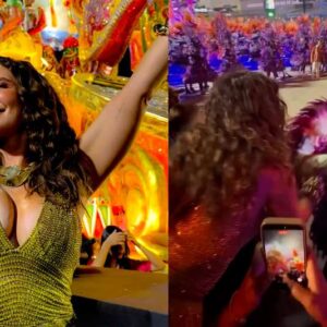 Paolla Oliveira beija bandeira da Grande Rio e mostra interação com Virginia ao assistir desfile na Sapucaí São Paulo