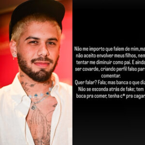 Hablou! Zé Felipe usou as redes sociais para rebater alguns comentários envolvendo o seu nome e dos três filhos, Maria Alice, Maria Flor e José Leonardo, frutos do antigo casamento com Virginia Fonseca. Através dos stories, o filho do cantor Leonardo fez um desabafo e pediu para que as pessoas respeitassem os seus herdeiros e também o seu papel como pai. Não me importo que falem de mim, mas não aceito envolver meus filhos, nem tentar me diminuir como pai. E ainda ser covarde, criando perfil falso para comentar. E finalizou:Quer falar? Fala, mas banca o que diz. Não se esconda atrás de fake; tem boca para comer; tenha c* pra cagar. Nos últimos dias, o cantor chamou atenção ao compartilhar uma publicação de Ana Castela na academia. Os dois terminaram o namoro no final de 2025, logo após reunirem a família no Natal.